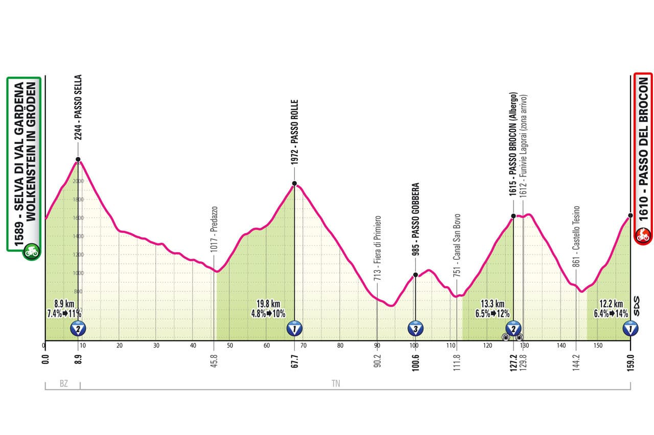 La siguiente etapa, la 17 es otra con recorrido muy interesante: 5 puertos categorizados, dos de ellos de primera categoría, se comienza subiendo y no hay ni un kilómetro llano en los 154 de longitud de este día entre Selva di Val Gardena y el Passo del Brocon. Un día ideal para que un equipo ambicioso (y fuerte) busque reventar la carrera y destronar a algún rival que esté ostentando el liderato.