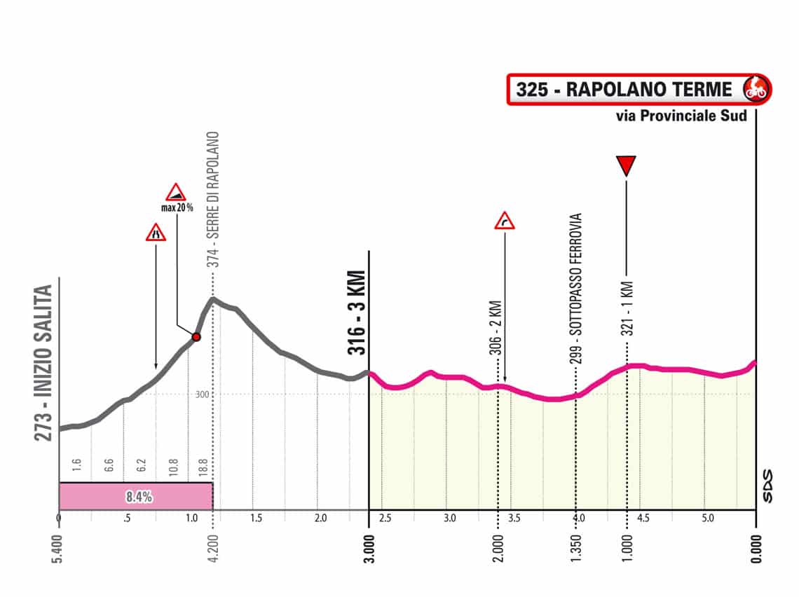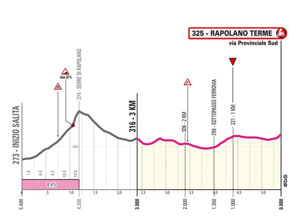 Es el muro de Serre di Rapulano, que son alrededor de 800 metros que alcanzan pendientes de hasta el 20%, que terminarán de romper la carrera, si es que no viene rota de antes.