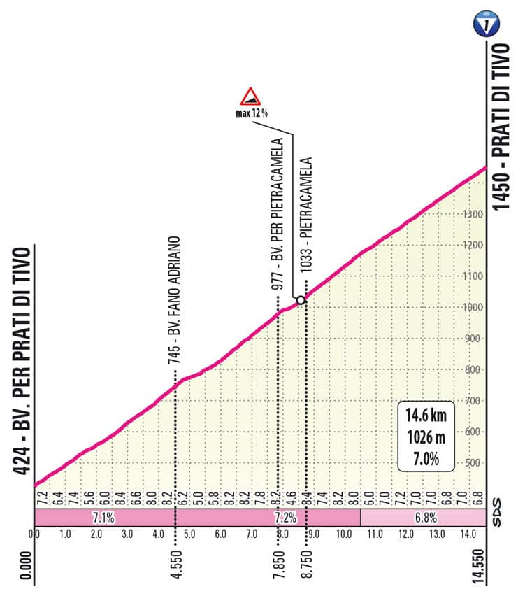 Prati di Tivo es una escalada molesta porque es larga (14.5 km) y no presenta ninguna irregularidad, es todo muy constante al 7%. Se subirá a velocidad crucero hasta que se enciendan las hostilidades, que puede ser en cualquier momento al ser iguales todos los tramos.