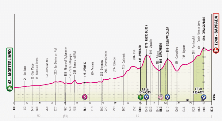 El segundo bloque de competencia arranca con una etapa de montaña con una muy dura llegada en alto: el puerto de Bocca della Selva. Los ciclistas tienen que haber aprovechado el día de descanso por que esta etapa presenta un perfil quebrado, con un puerto complicado en el punto medio en Camposauro, que irán mermando las fuerzas hasta llegar a Bocca della Selva que tiene 20 km de longitud y una pendiente promedio de 4,6%. Pero no se dejen engañar por ese porcentaje relativamente bajo, ya que ese promedio se reduce por la presencia de un par de descansos y porque los primeros 3 kilómetros del puerto son bastante tendidos, pero en los últimos 17 km de la etapa los ciclistas estarán subiendo siempre por encima del 5% de pendiente, con rampas de hasta el 14% y los últimos 4 kilómetros de subida prácticamente no bajan del 7,5%. Un puerto de resistencia, donde veremos una guerra de desgaste y quizá se amplíen más algunas diferencias en la general si alguien tiene un mal día y pierde la rueda.
