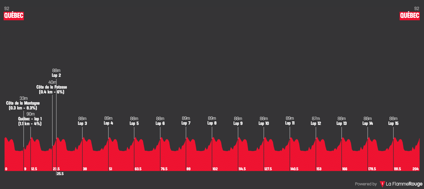 En la primera mitad del circuito, los ciclistas descienden desde el centro de Québec hasta el río durante los primeros cinco kilómetros, y luego, a lo largo de los cuatro siguientes, habrá una sección plana donde los equipos, en cada vuelta, se reorganizarán y buscarán posicionar a sus líderes en la parte difícil de la carrera.