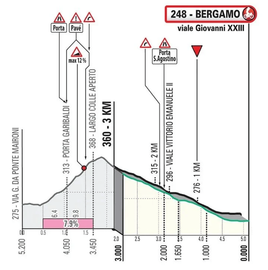 En la cima del Passo di Ganda quedarán solo 32 km a meta, primero los corredores afrontarán un largo descenso cuya segunda mitad es bastante técnica, antes de entrar en los últimos 16 km que son un falso llano favorable interrumpido solo por la última cota del día: Colle Aperto, un muro de aproximadamente un kilómetro de longitud con rampas de entre el 6 y el 10%, el sitio perfecto desde donde lanzar un ataque ganador desde un grupo pequeño, ya que se corona a escasos 3 km de la meta.