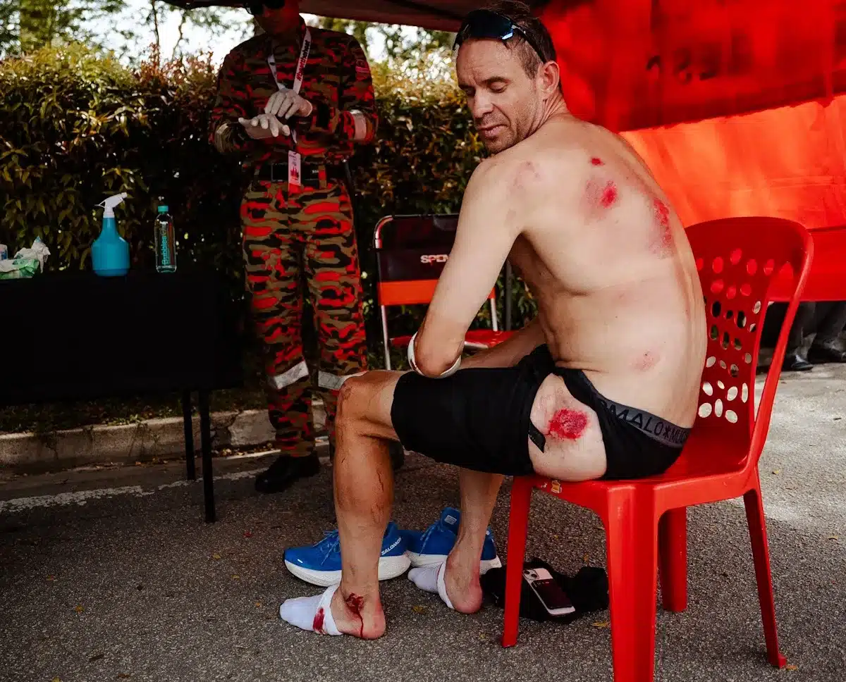 Explicó que perdió el control del manillar a alta velocidad cuando se deshizo de un envoltorio de gel en la zona de residuos. “Justo cuando no estaba mirando la carretera, y con una mano en el manillar, pisé asfalto en mal estado, y creo que el manillar se giró. La mano está bastante ensangrentada y llena de agujeros, y el brazo también está mal, así que me fue prácticamente imposible sujetar el manillar en esta condición”.
