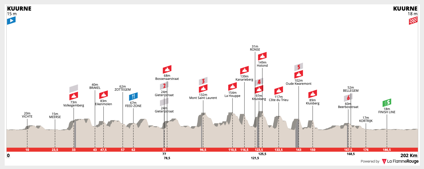 Change of route alert! In come the climbs of Mont Saint Laurent and La Houppe(harder side), in order to try and make the central section of the race a little harder. The organisers have also decided to take a different route back towards Kuurne, which means that the Tiegemberg and Nokereberg are out. The biggest difference is that the riders now only do one lap of the circuit to finish, which cuts the distance from the top of the Oude Kwaremont to the finish down from 85km to 59km.