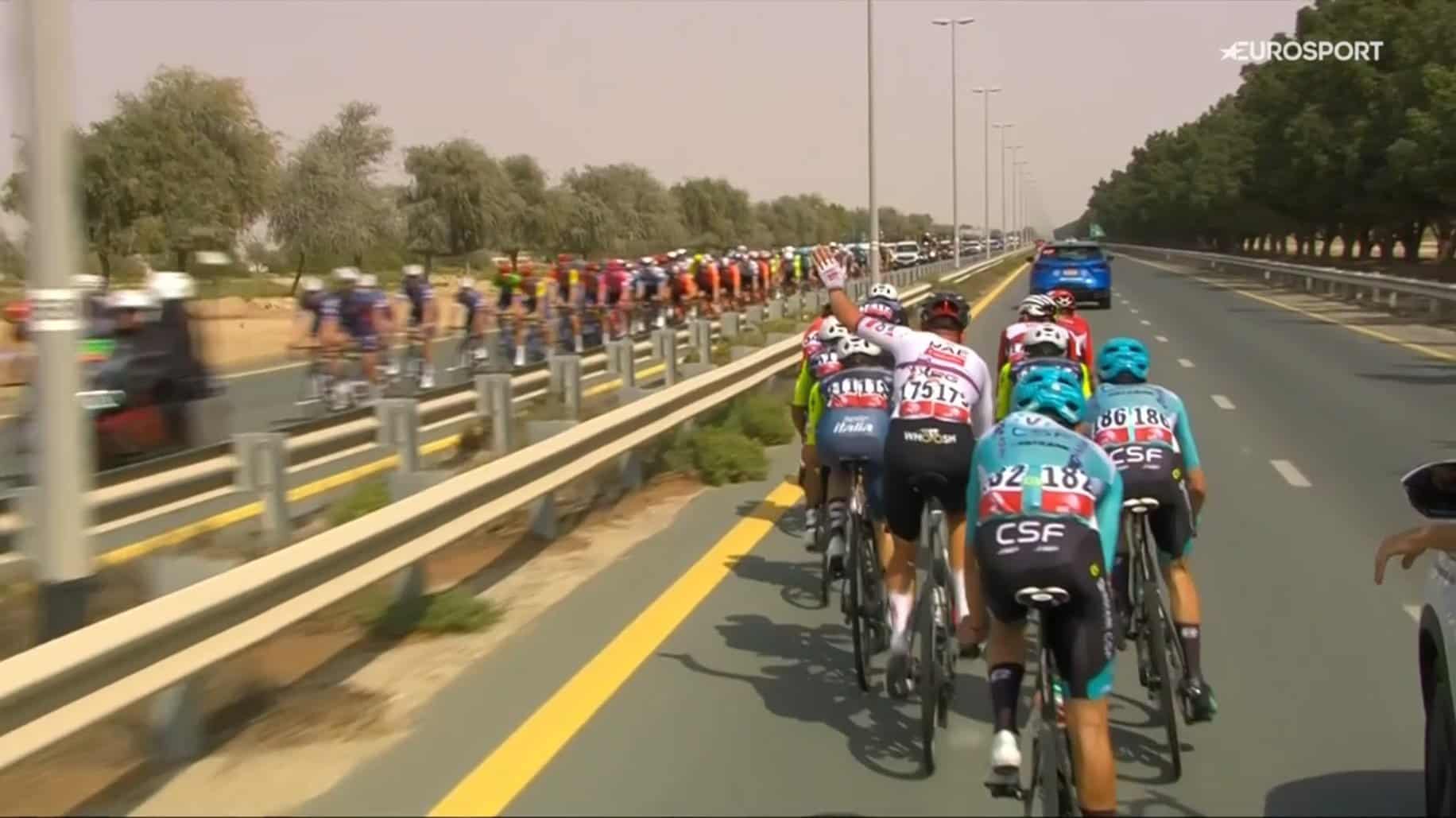 El “show” de Pogacar fue opacado, hacia el final de la etapa, por una multiplicidad de caídas. El UAE Tour, por motivos que desconocemos, sigue fijando la “zona segura” (en donde se neutralizan los tiempos por caída) a 3 kilómetros del final, pese a que una buena cantidad de carreras adaptaron sus reglamentos a la posibilidad –permitida por la UCI- a extenderla hasta los 4 o 5 kilómetros del final.