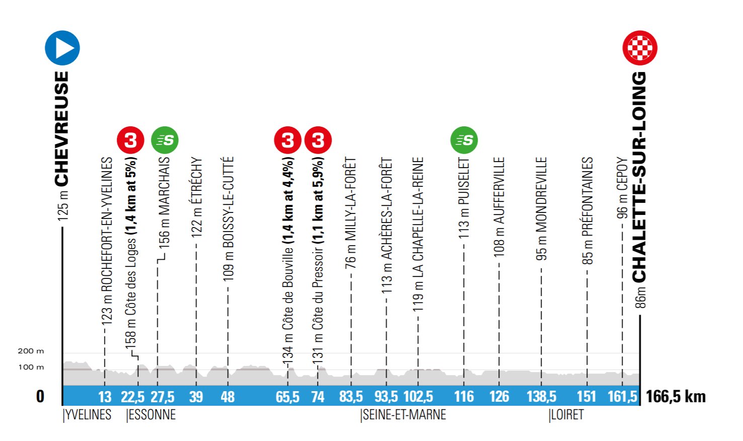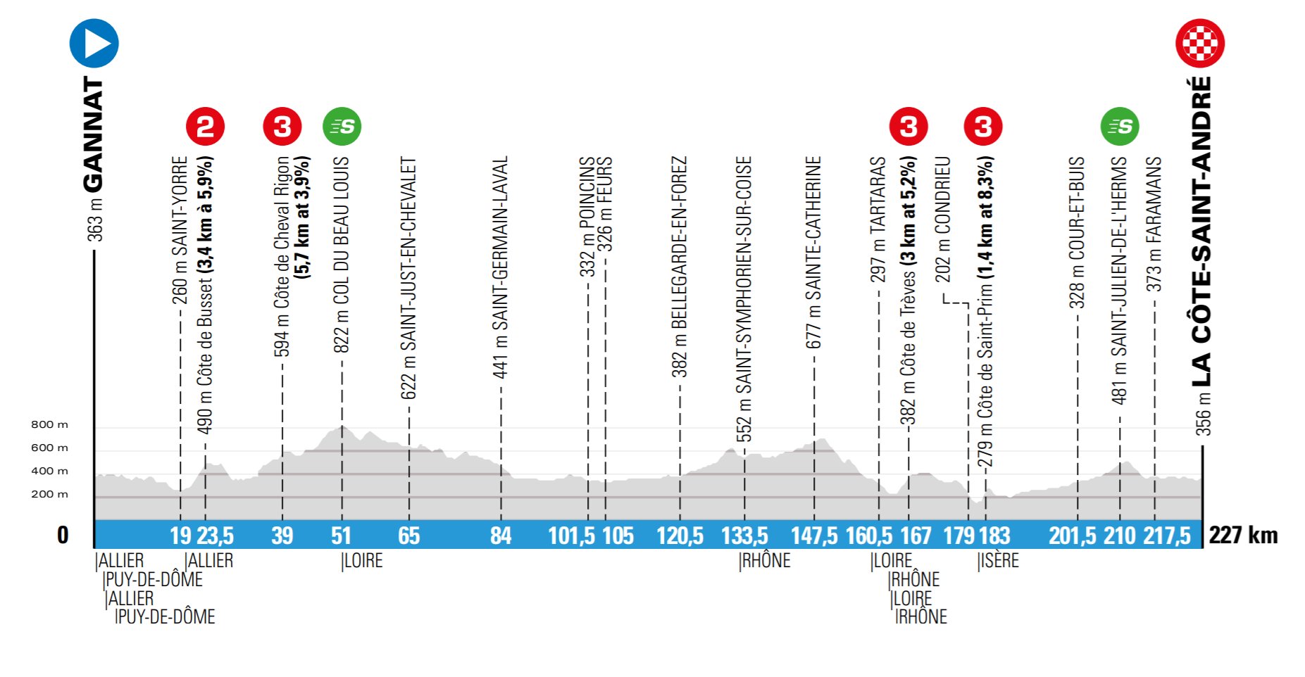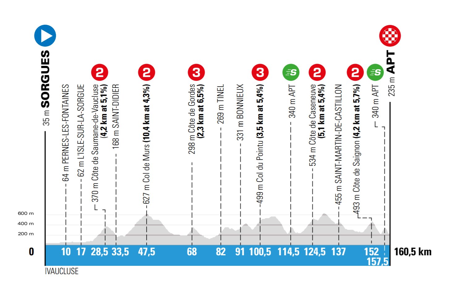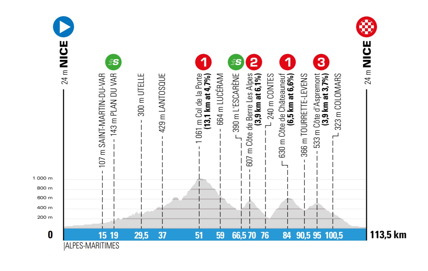 El único cambio importante será en la etapa final. El recorrido de esta -que fue exactamente igual en las últimas dos ocasiones- tendrá una nueva llegada frente al estadio Allianz Rivera del OGC Nice y ya no tendrá los pasos por el Col d’Eze y el Col de Quatre Chemins. En su lugar, las últimas dos trepadas serán más sencillas: la Cote de Chateauneuf (6.5km al 6.6%) y la Cote d’Aspremont (3.9km al 3.7%) para luego descender 18 kilómetros hacia la costa azul.
