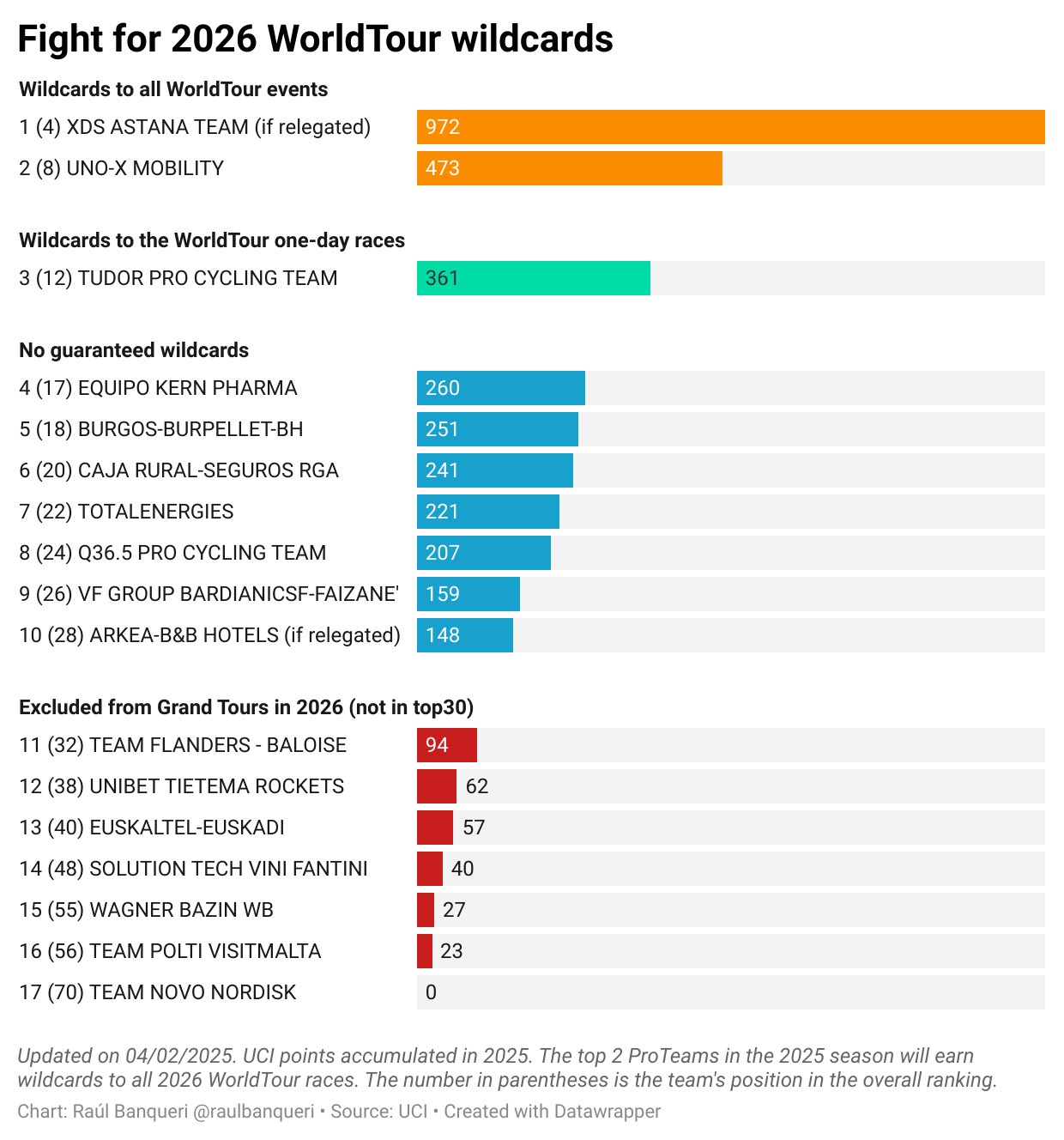 Finalmente, el gráfico señala aquellas formaciones que ni siquiera están en el Top 30, lo cual les impedirá de tener invitaciones en grandes vueltas en 2026: entre ellos está el Euskatel, equipo que suele recibir invitaciones a la Vuelta a España cada dos años según la rotación prevista entre formaciones españolas, y el Polti VisitMalta, un “habitué” del Giro d´Italia.
