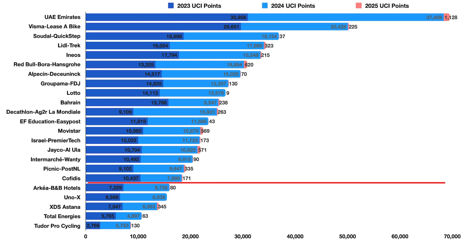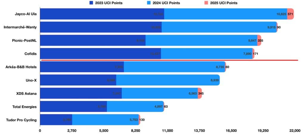 Como vemos, salvo que pase una muy improbable catástrofe, ya están los dos equipos que ascenderán al World Tour en 2026: el Lotto, que está en el noveno lugar (muy por encima del corte rojo que está abajo del decimoctavo equipo) y el Israel Premier-Tech, en decimocuarta posición. Si bien la elegibilidad es electiva –es decir, ambos equipos pueden elegir no ascender-, rechazar sería algo raro, ya que los sponsors logran mayor visibilidad con el ascenso.