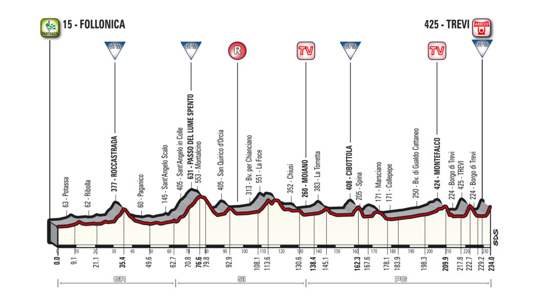 El segundo parcial será apto para los velocistas, al igual que el penúltimo. Mientras que, al tercer día, la etapa culminará con un repecho en Trevi donde se podrían marcar algunas diferencias mínimas entre los candidatos al título.