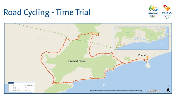Por otra parte, el recorrido de la contrarreloj es de 29,8 kilómetros y los hombres darán dos vueltas totalizando casi 60 kilómetros que incluyen el Circuito Grumari de la carrera en línea y sus 1200 metros al 4,5%, para finalizar en Tim Maia Square en Pontal Beach. Las mujeres sólo harán una vuelta y las dos pruebas serán el 10 de agosto.