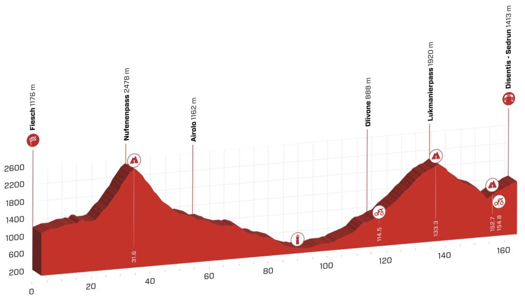 Sexta: fracción techo de la vuelta en el Nufenenpass 2500 msnm, (como paso intermedio). En la parte final se enfrenta el Lukmanierpass de primera categoría a 2000 msnm y la meta poco después en Disentis-Sedron. Séptima: la novedad este año una cronoescalada, (integrada a la habitual contrarreloj) se sube desde el lugar de inicio en Disentis-Sedrun hasta el Paso Oberalp 10 km a un 6% pero la otra mitad es en descenso hasta Andermatt.