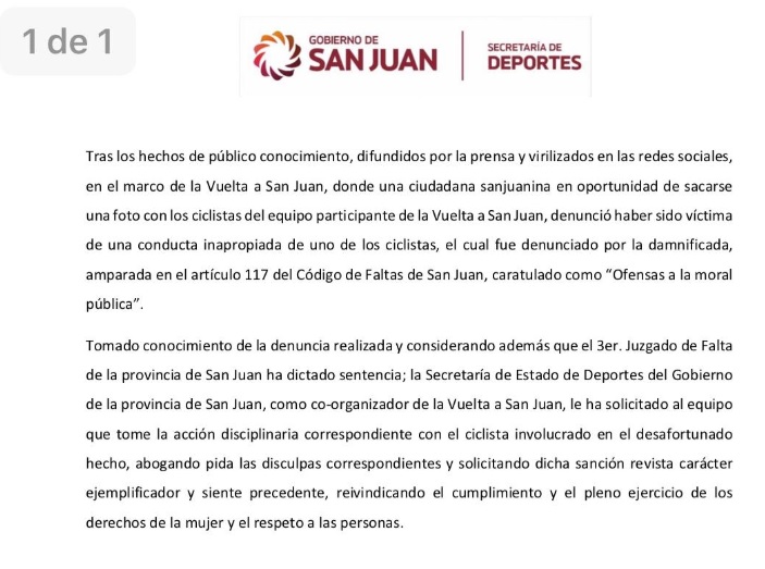 En el comunicado, desde la organización expresan que el hecho fue caratulado como “Ofensas a la moral pública”, y le han solicitado al equipo Deceuninck-Quick Step que “tome la acción disciplinaria correspondiente con el ciclista involucrado, abogando pida las disculpas correspondientes y solicitando dicha sanción revista carácter ejemplificador y siente precedente“.