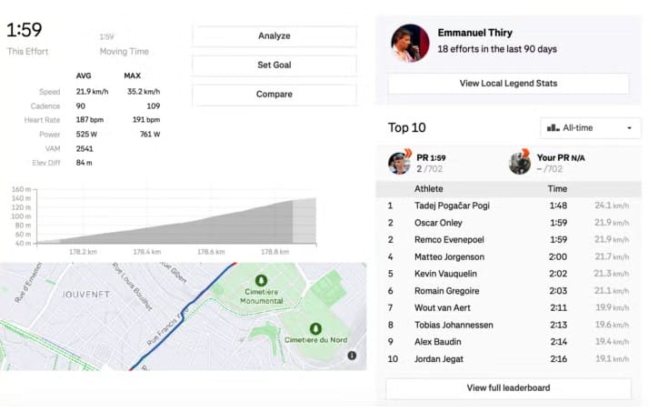 Si no se comprende tanto este número, siempre queda Strava para fijarnos. Pogacar se llevò el récord en el segmento Pétard Francis Yard que cubre la mayor parte de la subida a Sainte Hilaire con 1:48. Se desconoce la potencia que marcò pues el esloveno optoa por no publicarla. Vingegaard, que no usa Strava, probablemente habría marcado un tiempo uno o dos segundos más lento que la marca de 1:48 de Pogacar. Recordemos que el danés arrancó por detrás de Mathieu van der Poel lo cual retardó su tiempo de reacción.