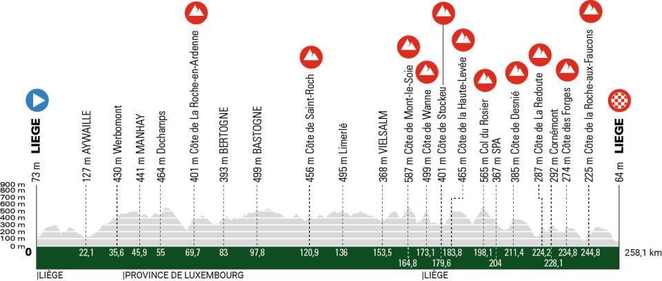 El recorrido de este año, como viene siendo parte de la identidad de la carrera durante mucho tiempo, es uno quebrado con mucha dificultad. Habrá once cotas categorizadas que están concentradas en el último tercio del recorrido y que morderán las piernas de los corredores que tendrán que completar 258 km sobre la bicicleta en esta región ondulada de Bélgica.