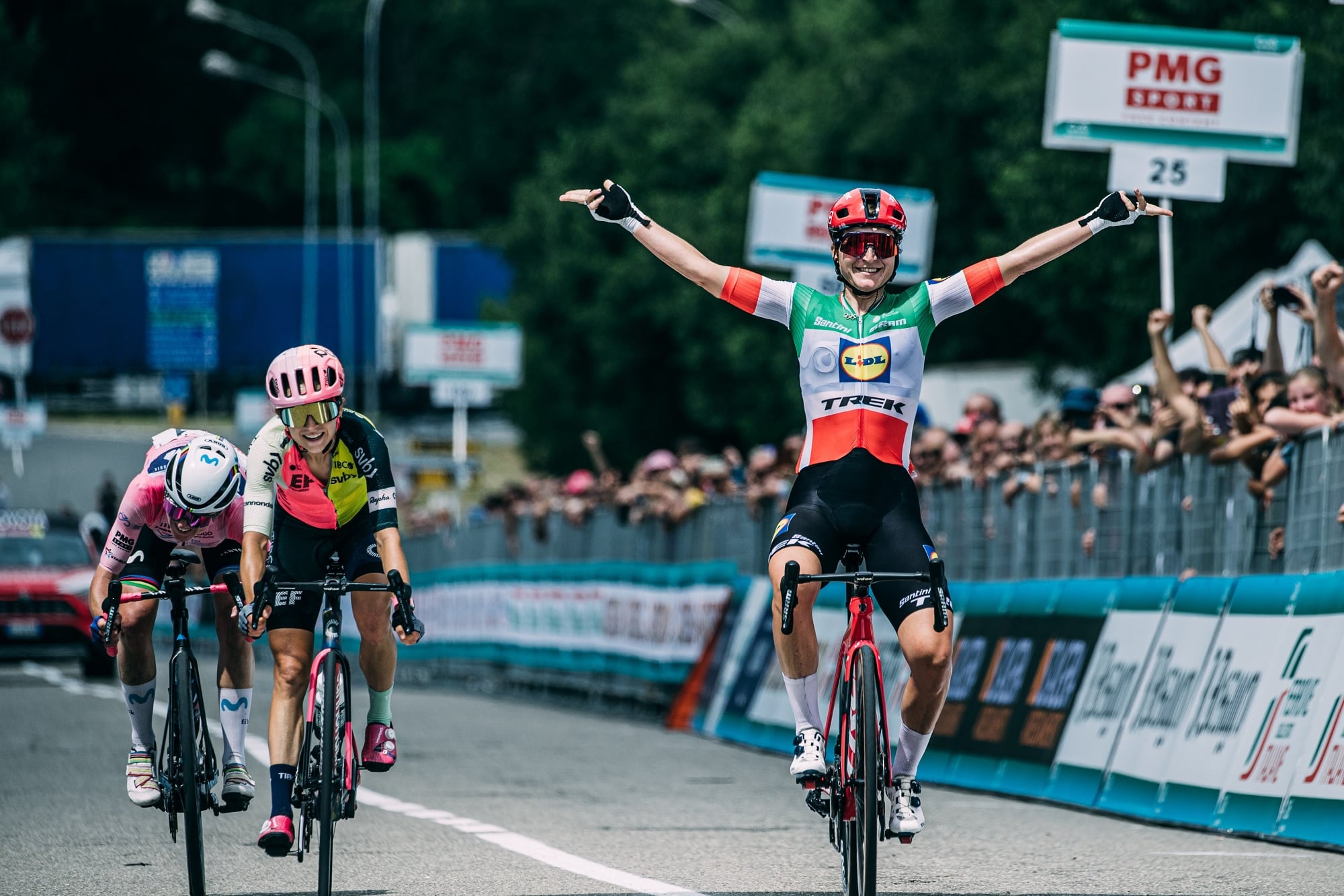 En el sprint de tres, se cumplió con la lógica y la explosividad de Longo Borghini marcó la diferencia sobre estadounidense y neerlandesa, que nada pudieron hacer ante el potente remate de la corredora de Trek.