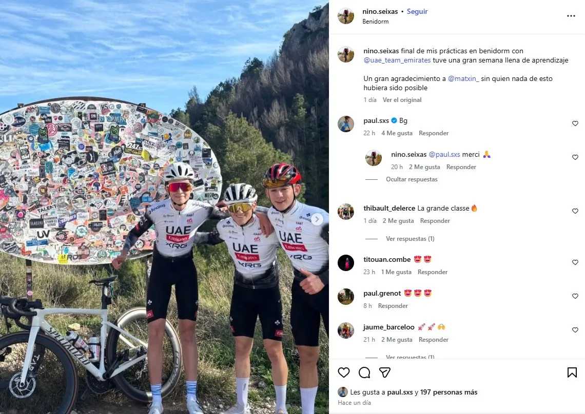 Sin embargo, UAE vuelve a la carga. El hermano menor de Paul, Nino Seixas, de 16 años, participó de prácticas de una semana con UAE en Benidorm, y le agradeció en redes sociales a Matxin, artífice de la decisión. La situación puede parecer extraña ya que UAE tiene una escuadra sub-23 pero no uno de categoría junior donde Nino pueda correr. Sin embargo, el portal francés Cycling Mag informó que el equipo emiratí está probando con “una docena” de corredores sub-19 y que podrían estrenar pronto su filial de categoría junior, el único nudo sin atar del eslabón hacia la escuadra principal. El hermano de Seixas formaría parte de la primera cohorte del mismo. ¿Un plan maquiavélico de UAE para atraer a Paul Seixas con sus petrodólares cuando se termine su contrato? ¿O un premio de consolación para Matxin tras no ser correspondido? El futuro lo dirá.
