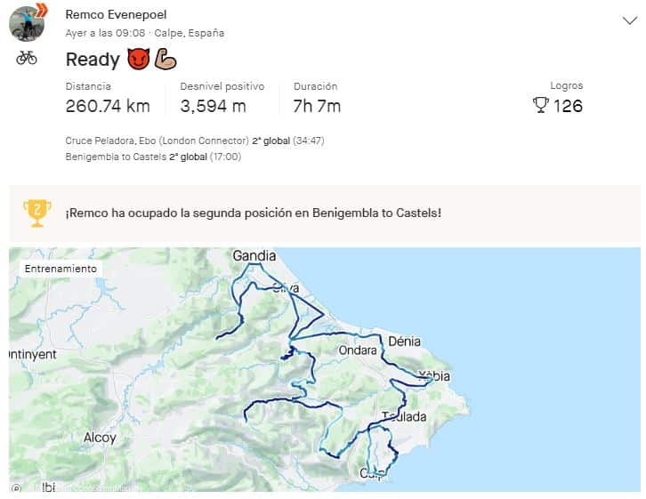 El trayecto lo realizó en territorio español, en la región del Calpe y tuvo una duración de siete horas con siete minutos, una autentica barbaridad a la que anexó el titulo de ‘Ready’, mostrando que ya está a punto para disputar el campeonato del mundo de ciclismo de ruta.