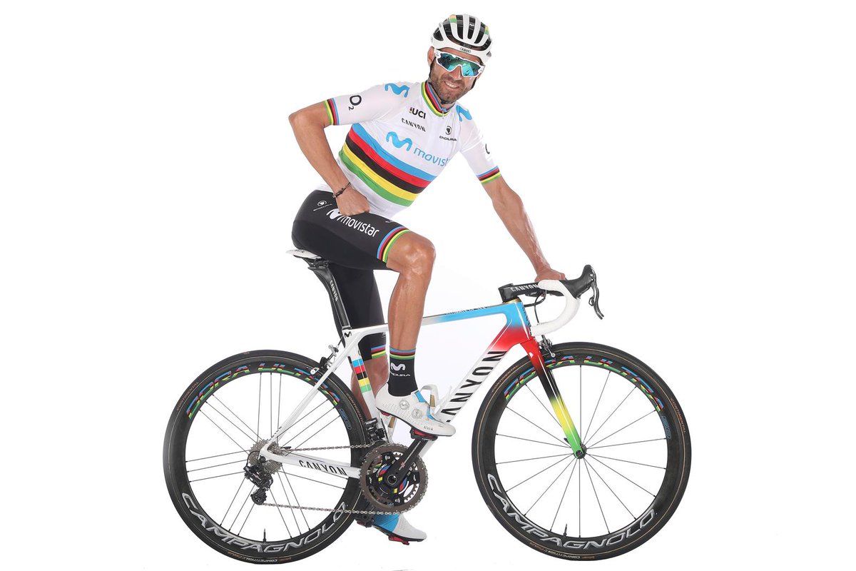 En la víspera de la última gran prueba del UCI WorldTour 2018, Il Lombardia, Alejandro Valverde (Movistar Team) estrena gran parte del equipamiento que merecidamente le corresponde como nuevo campeón del mundo de ciclismo en carretera.