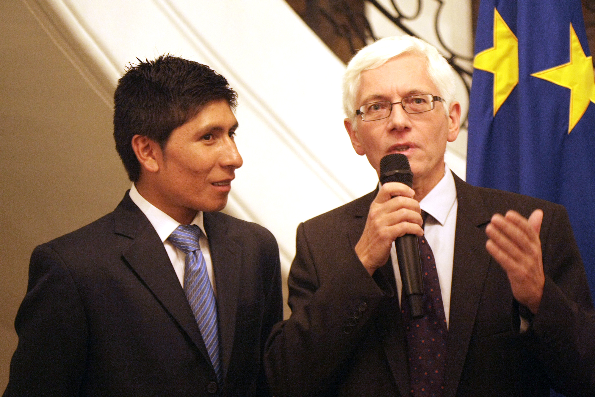 Como agradecimiento el corredor le regaló un poster al embajador con su autógrafo y una dedicatoria. Quintana por estos días hace la preparación física a la espera de la primera concentración de su equipo en territorio español.