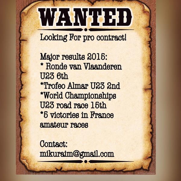 “Buscando equipo profesional”, dice, seguido de sus mejores logros como profesional, que incluyen el 6º lugar en el Tour de Flandes sub23, el 2º en la Coppa dei Laghi-Trofeo Almar, 15º en el Mundial sub23 y cinco victorias en Francia. “No está mal”, acota.
