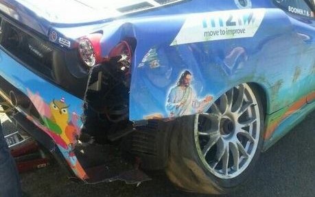 Pero algo ha sucedido, haciendo terminar al hombre de Mol fuera de pista y con el auto dañado.