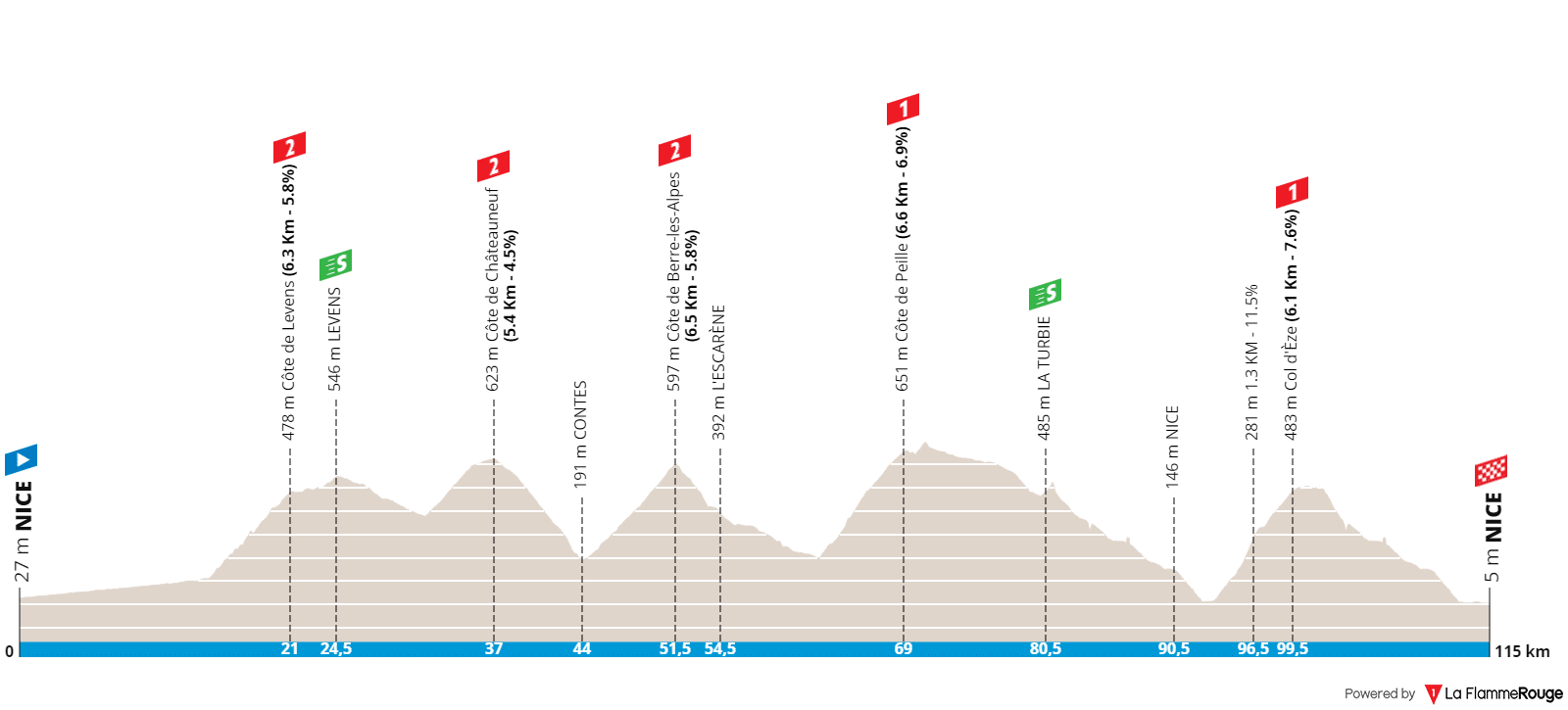 From there on the traditional fast descent into Nice and the flat finish at the Promenade des Anglais will be the location for the end of what should be an exciting stage and race.