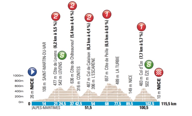 El Col d’Eze cierra el parcial y se corona a 15km de meta. Desde allí, un veloz descenso llevará a los atletas rumbo a Niza para un sprint reducido o, por qué no, para que algún valiente arribe en solitario.