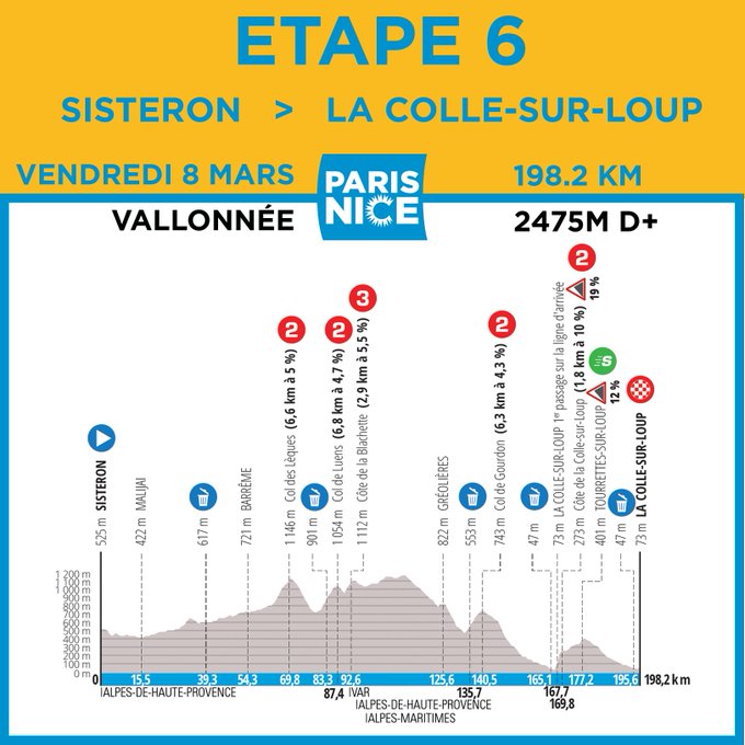 La penúltima fracción será la denominada etapa reina, con ascensos notables, incluida la subida final a Auron, situada a 1614 metros de altitud. La carrera tradicionalmente culmina con un importante recorrido en Niza el domingo (10 de marzo), que incluirá el famoso Quatre Chemins como la última prueba para los ciclistas.