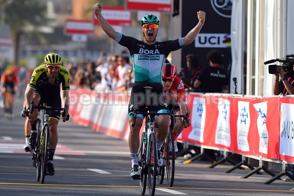 Pascal Ackermann (Bora Hansgrohe) ha sido el más rápido en un reñido embalaje entre la crema y nata de los sprinters mundiales en la primera etapa del Tour de Los Emiratos Árabes que se corrió en un circuito urbano en Dubai de 148 kms absolutamente llano.