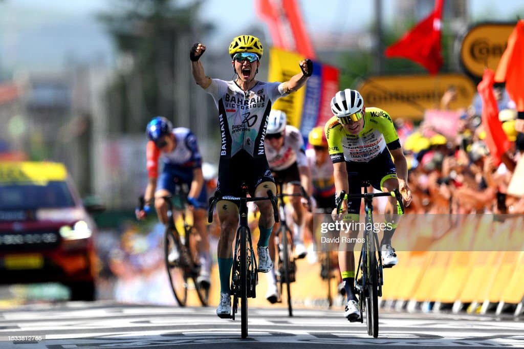 Pello Bilbao (Bahrain-Victorious) celebró en la décima etapa del Tour de Francia 2023, diseñada sobre un terreno ratonero de 167.2 kilómetros entre Vulcania e Issoire con cinco ascensos categorizados en el perfil. El vasco fue el mejor de una compleja fuga y supo adaptarse a la perfección a la situación de carrera, que de paso, le permitió escalar en la general.