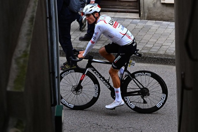 Uno de los que peor cara tenía hoy tras la caída en Dauphiné era Juan Ayuso. El español hizo el tramo neutralizado agarrado del coche y haciendo claros gestos de dolor, incluso evitando pedalear hasta que llegó a meta.