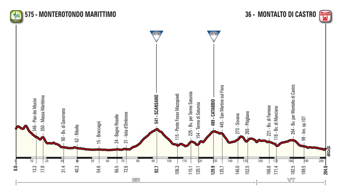 La tercera etapa comienza en Monterotondo Marittimo y, pese a un terreno quebrado, el cierre debería ver un sprint en Montalto di Castro. ¿Repetirá allí Fernando Gaviria?