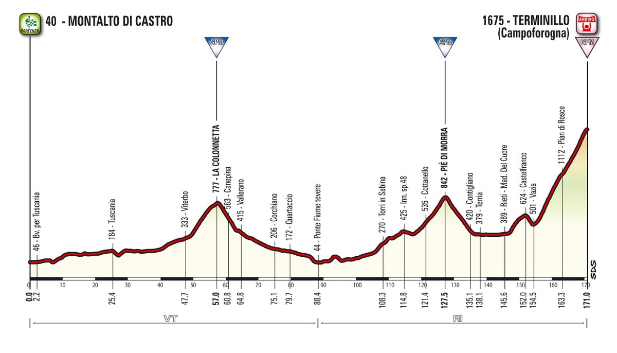 La general se decidirá, casi con seguridad, en el siguiente parcial, que incluye dos puertos y un tercero como final en alto. Más precisamente, se trata del Terminillo, ascensión que se incluyó en 2015 y en la que Nairo Quintana se lució bajo la nieve, asegurándose el “Tridente”.