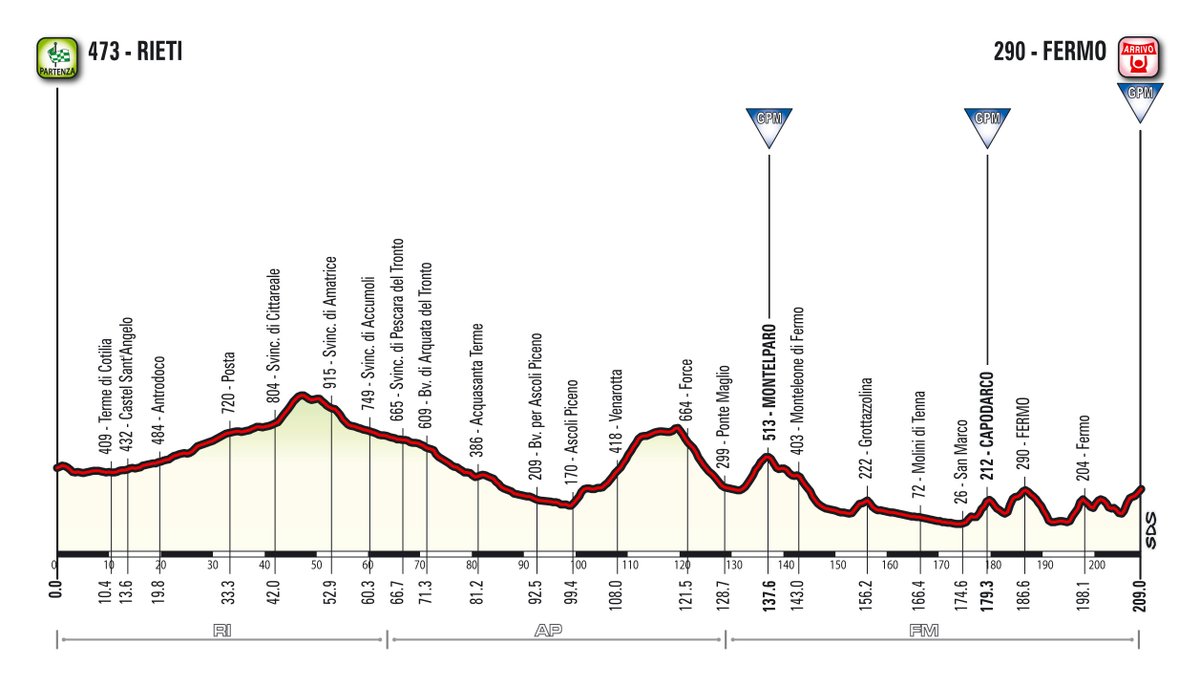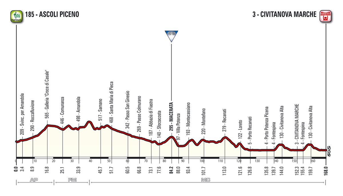 Los sprinters volverán a tener protagonismo el 13 de marzo, un tramo mayormente plano con salida en Ascoli Piceno y meta en Civitanova Marche. Al día siguiente, se coronará al campeón tras la habitual crono individual de 10.1km en San Benedetto del Tronto.