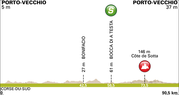 El pelotón transitará un total de 269 kilómetros en esta edición 2016. El primer parcial se disputará con salida y llegada en la ciudad de Porto – Vecchio, para un total de 90.5 kilómetros, con una única dificultad: Côte de Sotta en el kilómetro 73,5 con 1.100 metros al 5,6%, por lo que está asegurado el sprint.