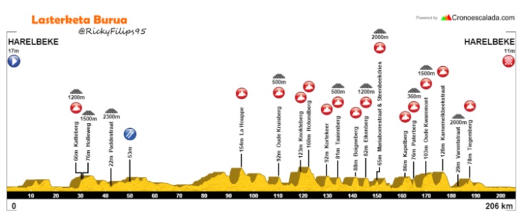 El punto clave debería ser el Paterberg, que viene seguido por el Kwaremont. La diferencia con el resto de las carreras, es que aquí el Paterberg está primero y sirve de aperitivo de cara al Kwaremont.