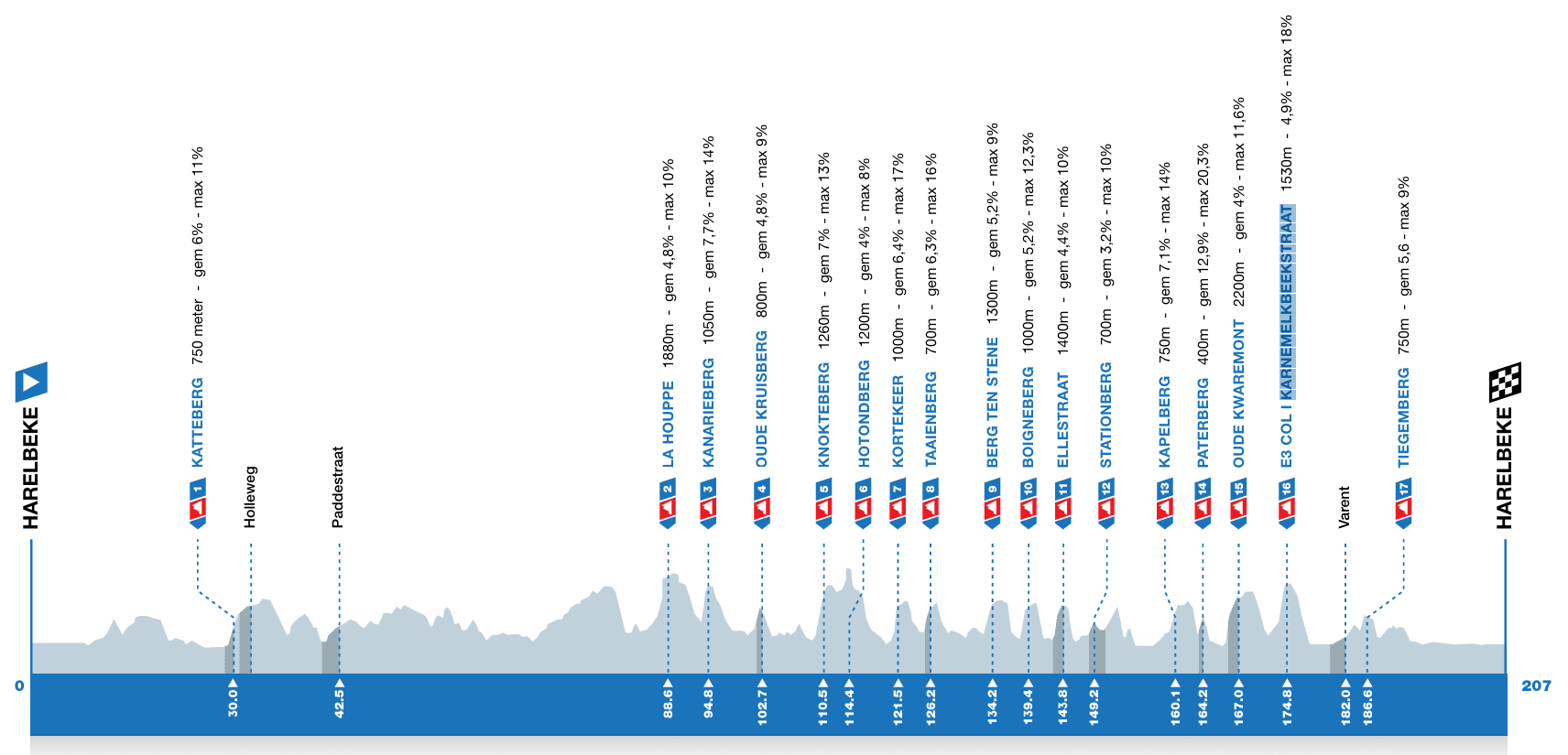 La edición 2024 de la E3, la número 66, tendrá una longitud de 207 km con partida y final en la ciudad de Harelbeke. Los ciclistas subirán la cruel cantidad de 17 muros y 9 tramos de adoquín que es lo que le da la sazón a esta carrera.