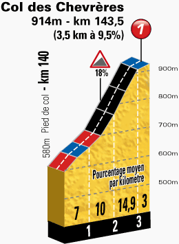 • Km 143.5 – Col des Chevrères (914 m) 3.5 km al 9.5% – 1° cat