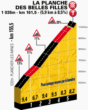 • Km 161.5 – La Planche des Belles Filles (1 035 m) 5.9 km al 8.5% – 1°cat