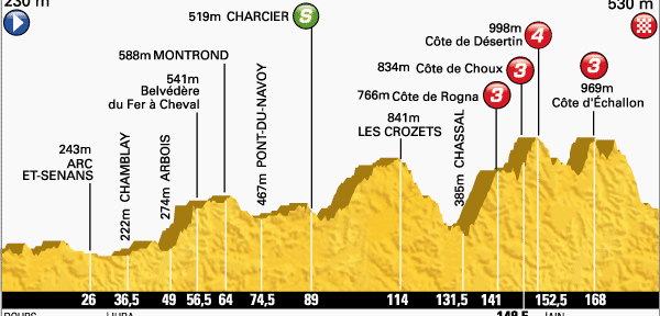 • Km 152.5 – Côte de Désertin3.1 km de subida a 5.2% – categoría 4