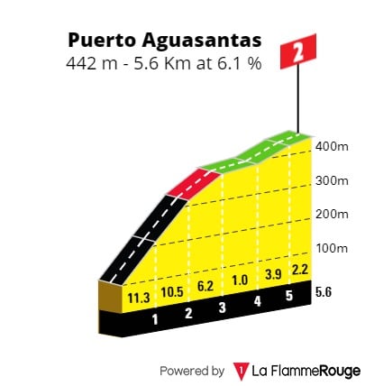 Entre aguasantas y la última cota, hay casi 40 km que incluyen un sprint bonificado y un puerto sin categorizar. El ascenso conclusivo es un muro de casi 3 km al 9%.