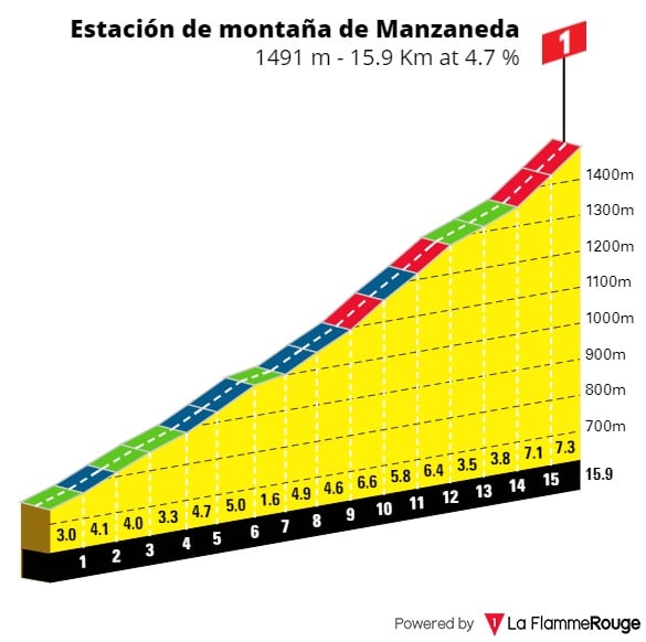 Etapa ondulada, repleta de repechos, con 3088 m de desnivel acumulado y un final en alto sencillo.