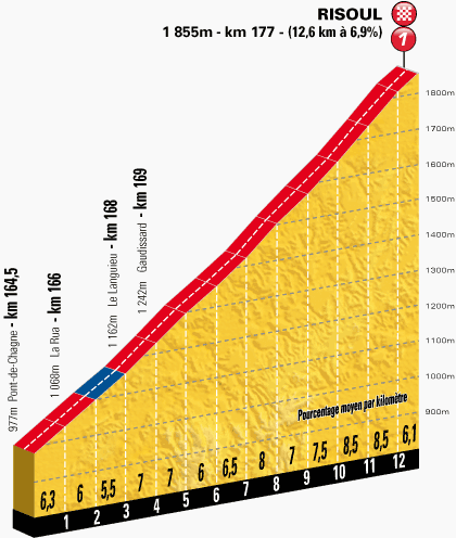 • Km 177.0 – Montée de Risoul (1 855 m)12.6 km al 6.9% – 1°cat
