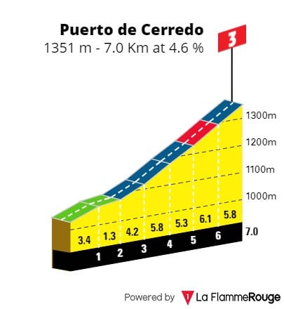 Es una fracción extraña, con dos grandes puertos y con los 100 km iniciales en constante ascenso. La última cima se corona a 16 km de meta. Vamos a echar un vistazo a las trepadas: