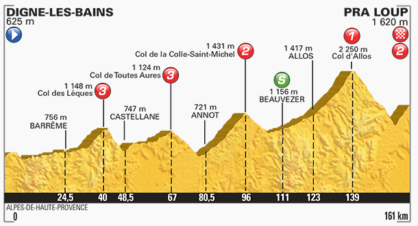 Lo verdadero empezará en el Col de la Colle Saint-Michel y sus 11km al 5.2% donde esperamos un ritmo elevado. Luego del descenso, empieza el extenso Col d’Allos, medido en 14km al 5.5%, aunque en realidad la ruta pica hacia arriba durante unos 40km. Este será el primer test para los gallos y encima se llegará bastante alto, a 2250mts, para luego dar paso a un pronunciado descenso y a la última trepada del día.