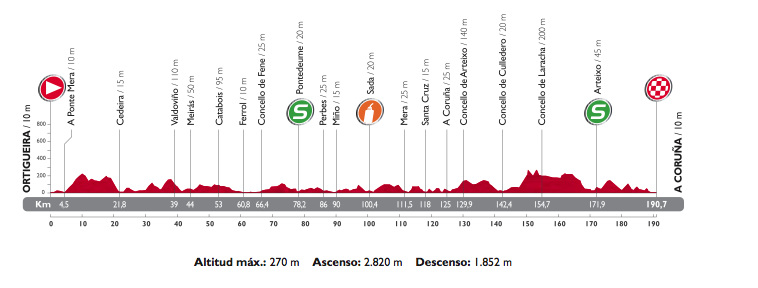 El perfil no le hace justicia a la jornada, pero nosotros sabemos que las rutas de esta región suben y bajan permanentemente y eso hará las cosas más duras. Sin cotas categorizadas la gente piensa enseguida en un sprint pero esto no está garantizado. Sin embargo, esta puede ser la última chance para los hombres rápidos y hay varios conjuntos que trabajarán para que eso pase. Giant, Orica y Lampre tratarán de limitar la ventaja de la fuga, aunque si se meten en ella los hombres indicados será muy difícil neutralizarla.