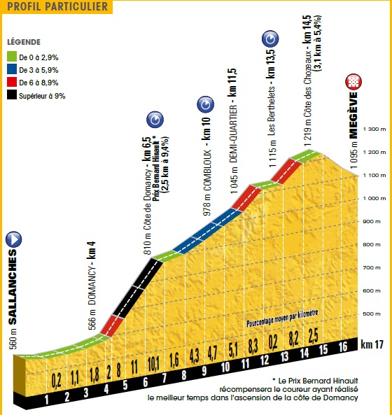 El parcial inicia con un tramo casi llano de 4.5 kilómetros que da paso a la citada cota de Domancy, 2,5 km al 9,4 %. Atentos porque esconde un kilómetro al 11% y otro al 10.1%. Esta es su altimetría: