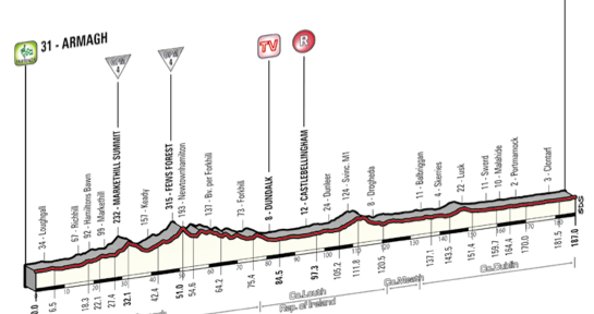 Tenemos un inicio con un leve desnivel con dos puertos de 4º categoría antes de entrar en un terreno completamente plano camino a Dublin. El principal problema será el clima ya que hay una alta probabilidad de lluvias y vuentos fuertes del oeste, por lo que el pelotón tendrá viento cruzado toda la jornada. Estas inclemencias climáticas pueden dejar algún sprinter sin disputar, pero tambièn a alguno de los jefes de fila, por lo que habrá muchos nervios.