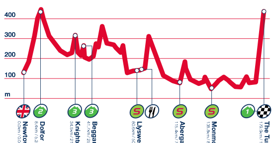 El pelotón se encamina hacia el sur a través de Gales. Hay tres trepadas en el tramo inicial del día pero todo se decidirá en la última, ¡The Tumble!