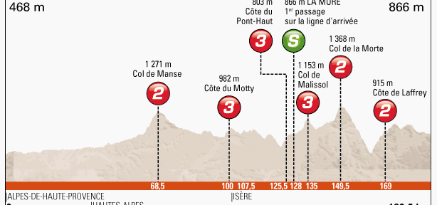 Todas las trepadas están aglutinadas en un tramo de 100 kilómetros, lo que hará muy difícil de controlar para el Team Sky. El hecho de que quisieron entregar el liderato a Bouet puede ser tomado como una señal de debilidad y una admisión de que su formación no es la más fuerte. ¡Quizás debieron traer a Bradley Wiggins!.